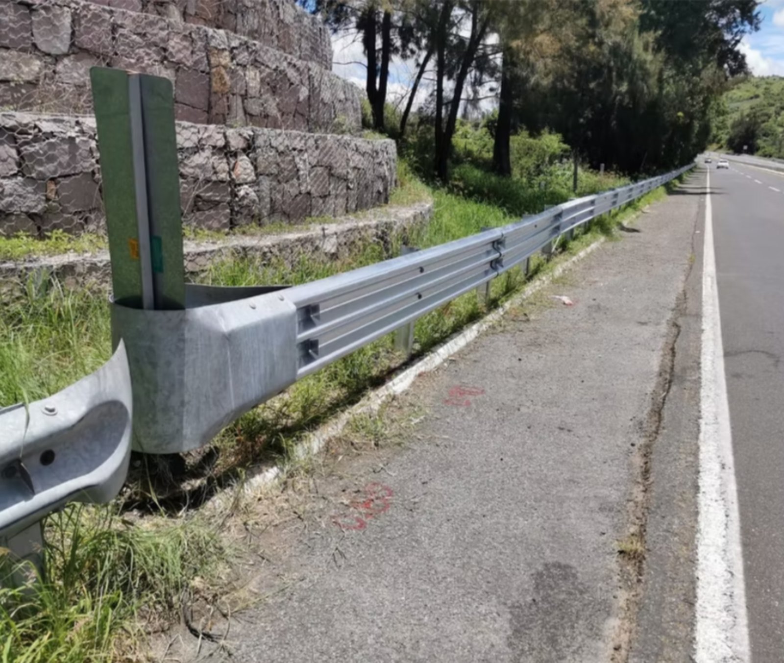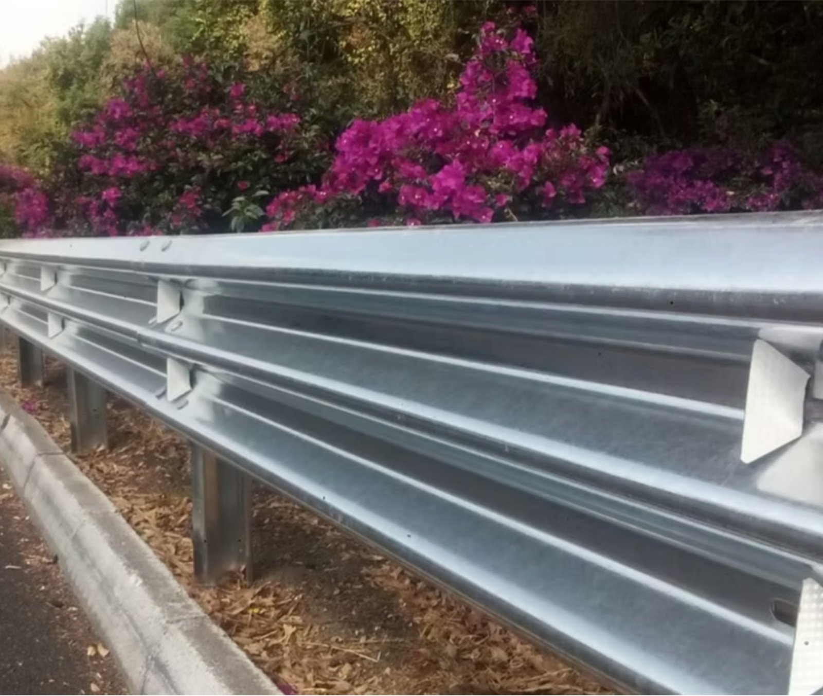Defensa metálica de 3 crestas diseñada para protección vial, ideal para carreteras y zonas de alto riesgo.