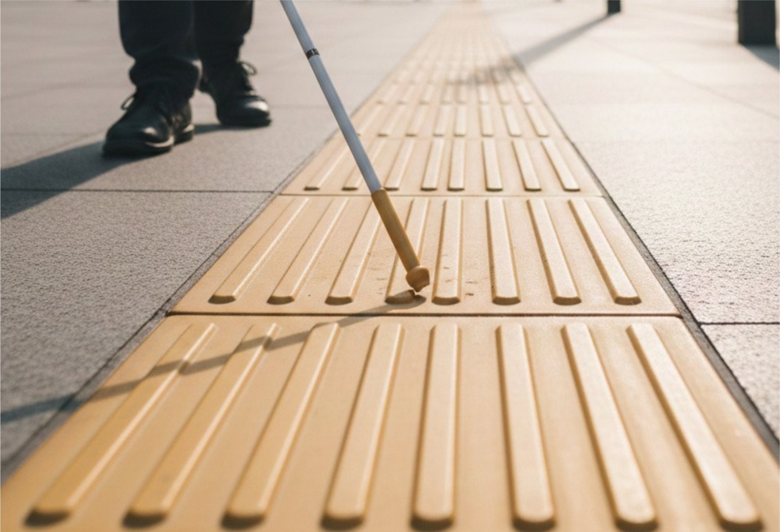 Piso podotáctil de aluminio y hule PVC, diseñado para guiar y alertar a personas con discapacidad visual en espacios públicos.